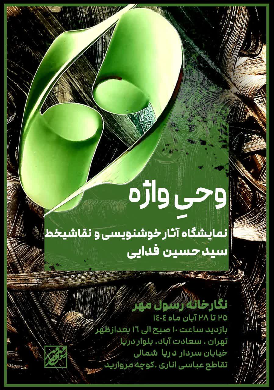 “وحیِ واژه” عنوان نمایشگاه خوشنویسی و نقاشیخط از هنرمند خوزستانی سید حسین فدائی است که از تاریخ ۲۵ تا۲۸ آبانماه سال جاری در نگارخانه رسول مهر تهران برگزار میشود.